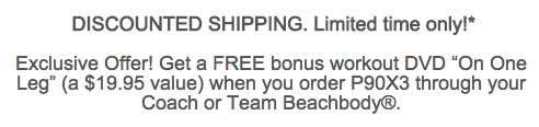 If you order the P90X3 Challenge Pack on TeamBeachbody.com, you’ll receive the P90X ONE on ONE® “On One Leg” workout (a $19.95 value)FREE!